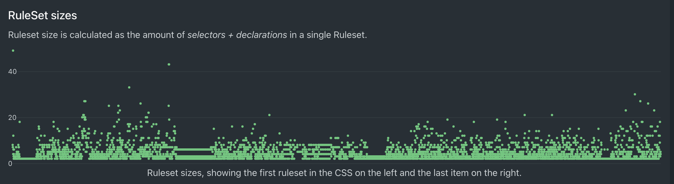 Zooming in shows that there is a single function ($e) that takes up almost 700ms to render. It turns out it’s one of the scatter plots that we use to show Ruleset and Selector complexity.